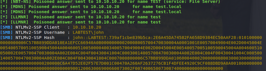 An adversary can spoof an authoritative source for name resolution by responding to this multicast request by a victim as if they know the identity of the shared drive a victim wants to connect with and in turn request its NTLM hash. This means that the attacker has now poisoned the service!