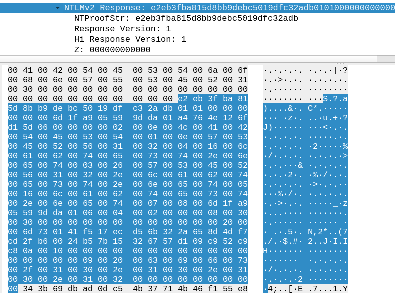The hashed user password is computationally baked into the transmitted NTLM response (see computation scheme above), which enables us to break the password through offline cracking.