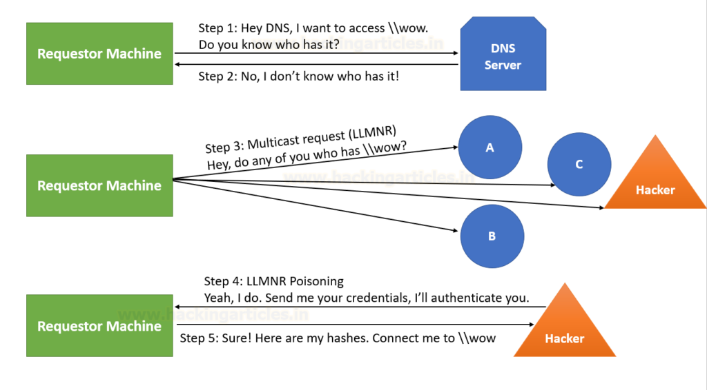 Let’s say a victim wants to connect to a shared drive \\test so it sends the request to the DNS server. The only problem is that DNS can’t connect to \\test as it doesn’t exist. Therefore, the server replies back saying he can’t connect the victim to \\test. Thereafter, the victim will multicast this request to the entire network (using LLMNR) in case any particular user knows the route to the shared drive (\\test).