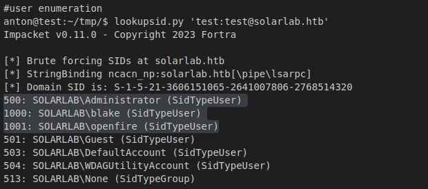 Further investigation using a SID brute-forcing tool, lookupsid.py, helped me enumerate existing user accounts on the Windows machine.