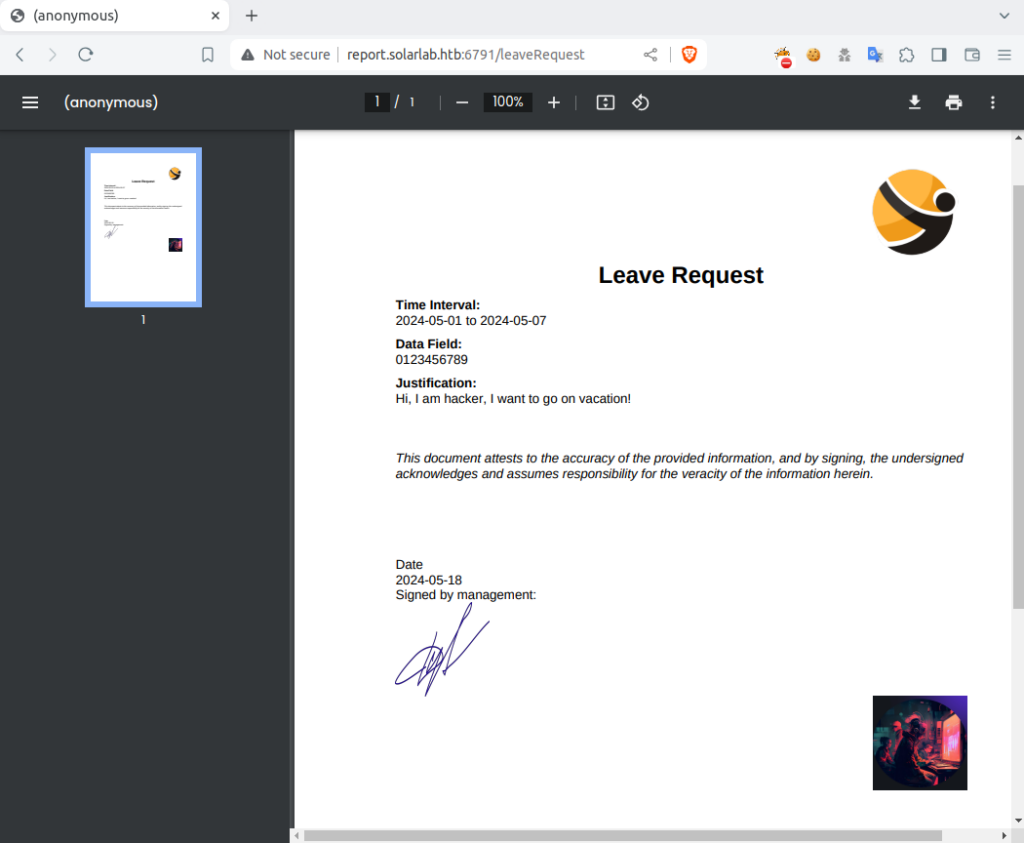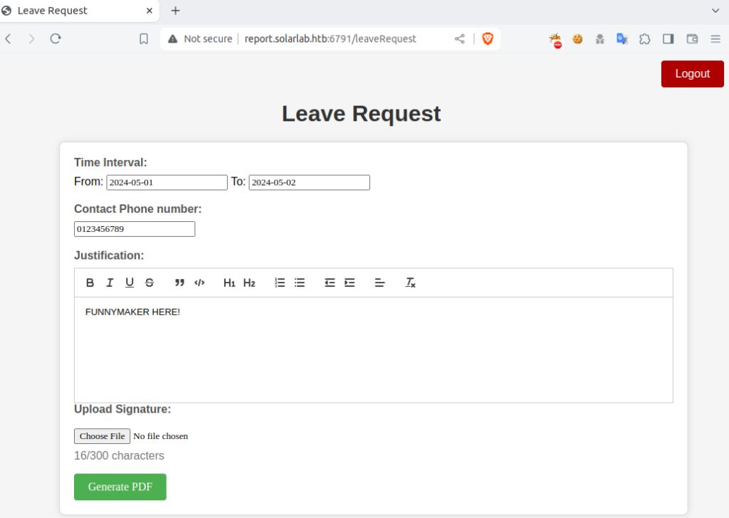 Inside the application, I’ve discovered a feature that allowed users to submit a “Leave Request”. This involved uploading a signature, which was then used to generate a PDF document. Using Burp Suite to inspect the requests, I’ve noted that the PDF generation was handled by ReportLab.